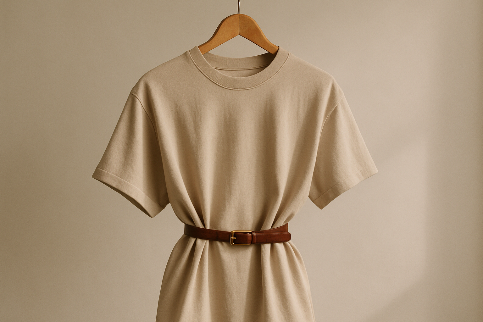 Belting over tee (4 steps): 1) Put tee on, 2) Choose a 3–4 cm structured belt or 25–35 mm wide leather belt, 3) Fasten at natural waist or slightly above, 4) Adjust tee hem so belt compresses evenly. Use stiff belts to avoid fabric bulging. For men: belt under a single‑button blazer creates a torso break without looking feminine.